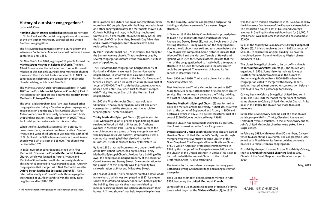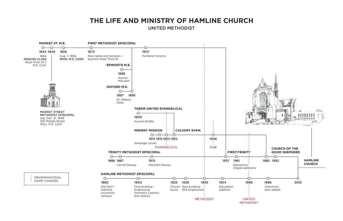 The 2010 merger of Hamline United Methodist Church with the Church of the Good Shepherd connected the Hamline congregation to the first Methodist Episcopal Church in St. Paul established in 1848, as well as a series of Evangelical United Brethren congregations.