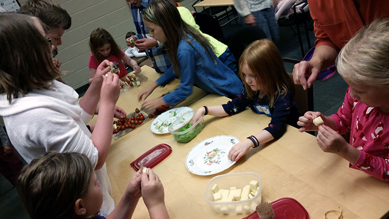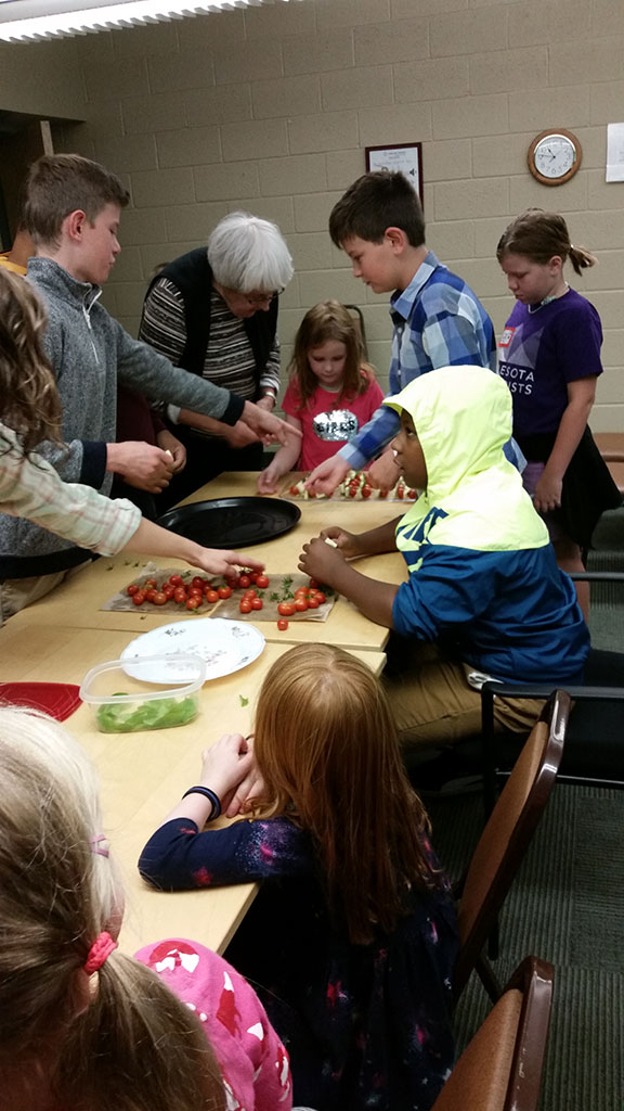 On August 15, after the 10th Anniversary SPROUT Garden commemoration during the worship service, coffee hour was a “garden to table” collaboration between the second-Sunday hospitality team, Hamline Kids, the SPROUT Garden team, and the Hamline Church Earthkeepers. The Hamline Kids assembled caprese salad bites (with some assistance/guidance from the Earthkeepers) using locally made cheese, basil from an Earthkeeper’s home garden, and tomatoes harvested from the SPROUT Garden that morning. The trays of local bites were the centerpiece of the coffee-hour spread, connecting the dots between the kids’ Sunday school efforts, the bounty of the SPROUT Garden, and the church’s hospitality ministry.